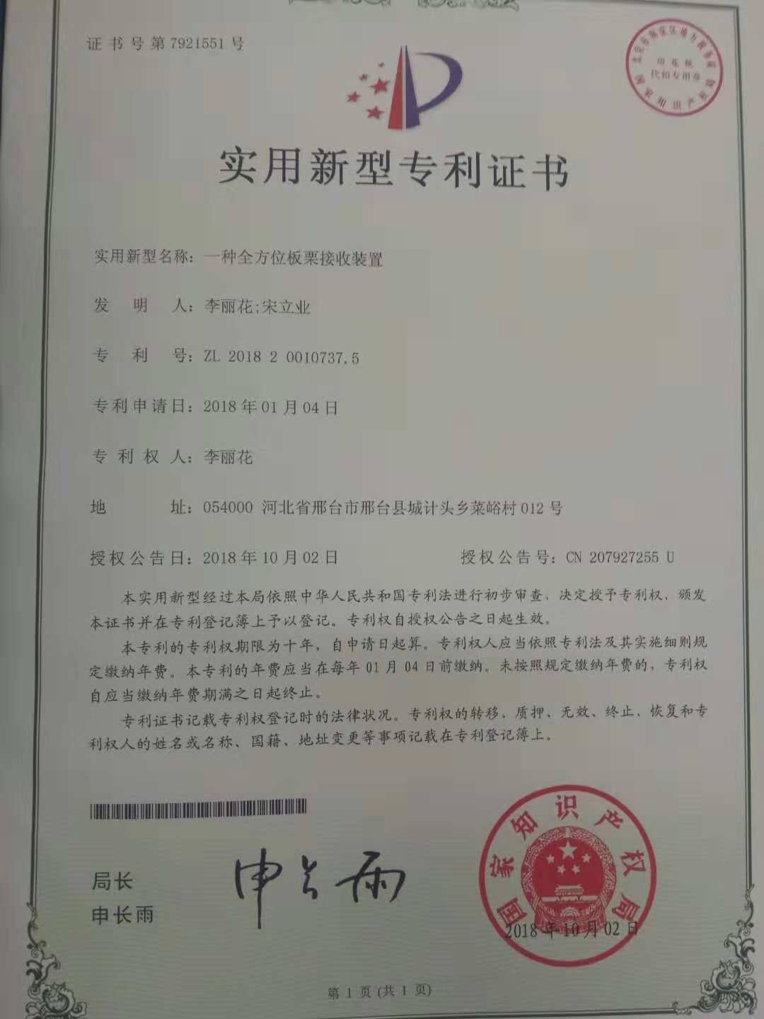 经申请,该项专利研究获得了国家专利局颁发的《实用新型专利证书》。该项实用新型专利,能够为板栗种植户有效解决在收获板栗过程中手被扎伤、费时、耗力等问题,打破了传统的人工逐个捡的收集方式,提高了工作效率,在一定程度上避免了减产,降低了收集过程中的危险性。