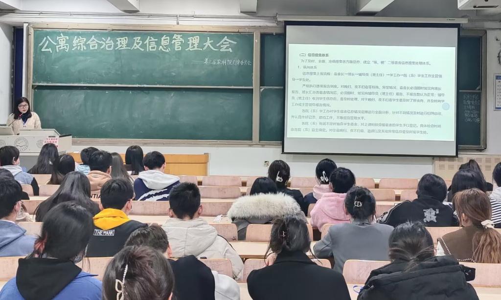 为了切实提高学院学生公寓管理水平,增强学生公寓信息搜集和处理能力,提升宿舍文化建设水平,2023年3月8日,beat365唯一官网入口召开了宿舍综合治理和信息管理工作会议,主要就宿舍综合治理管理规定和宿舍文化建设等方面工作做了培训和交流。全院100余名宿舍长参加了会议。